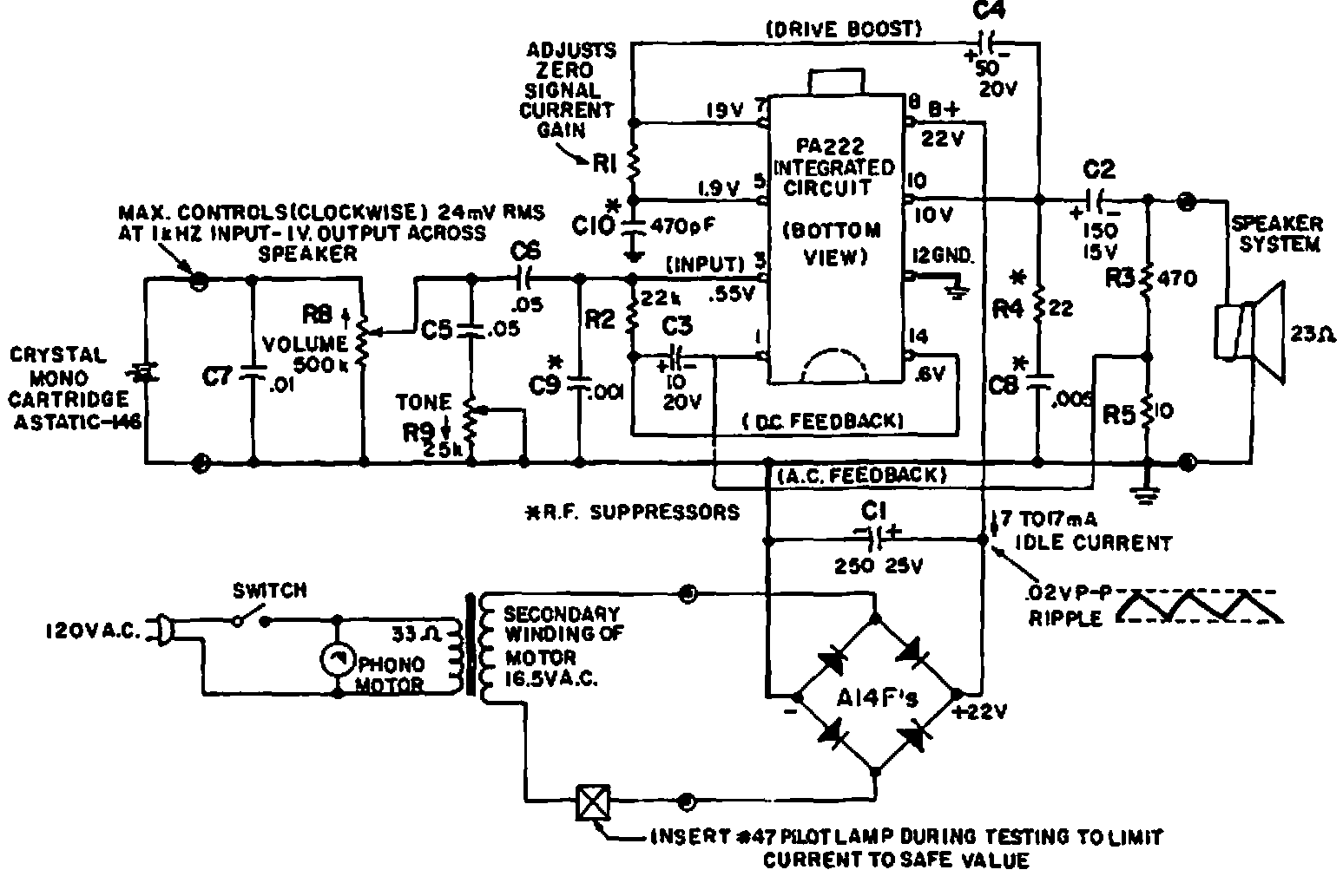 Este pequeño amplificador fonográfico se encontró en una documentación de General Electric de 1967. El circuito integrado es de esa época y proporciona 1,5 W de potencia de salida.