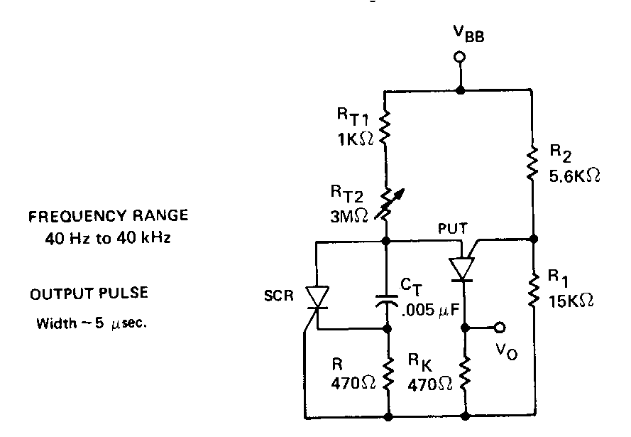 Encontrado en la documentación de Unitrode de la década de 1980, este circuito utiliza PUT, actualmente componentes comunes. El circuito debe ser alimentado con tensiones alrededor de 15 V.