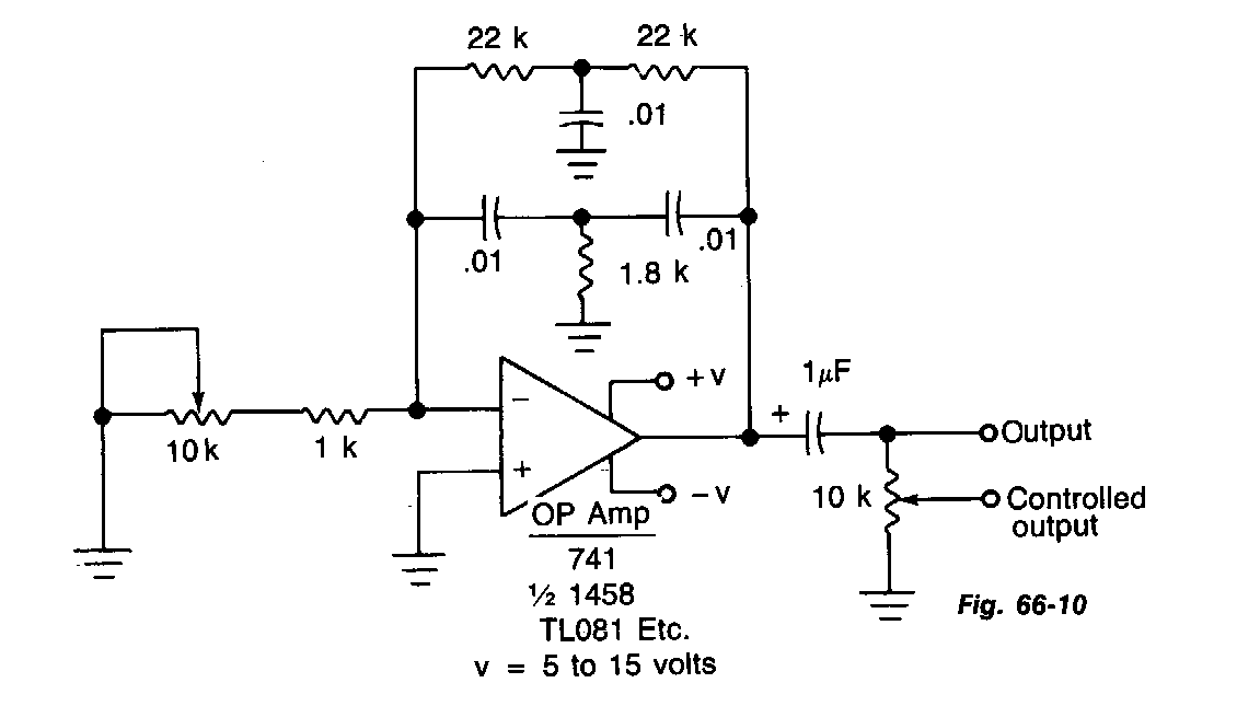 Este circuito fue publicado en una documentación estadounidense de los años 80, pero aún está vigente. La alimentación depende de lo operacional. La señal generada tiene una forma de onda sinusoidal.