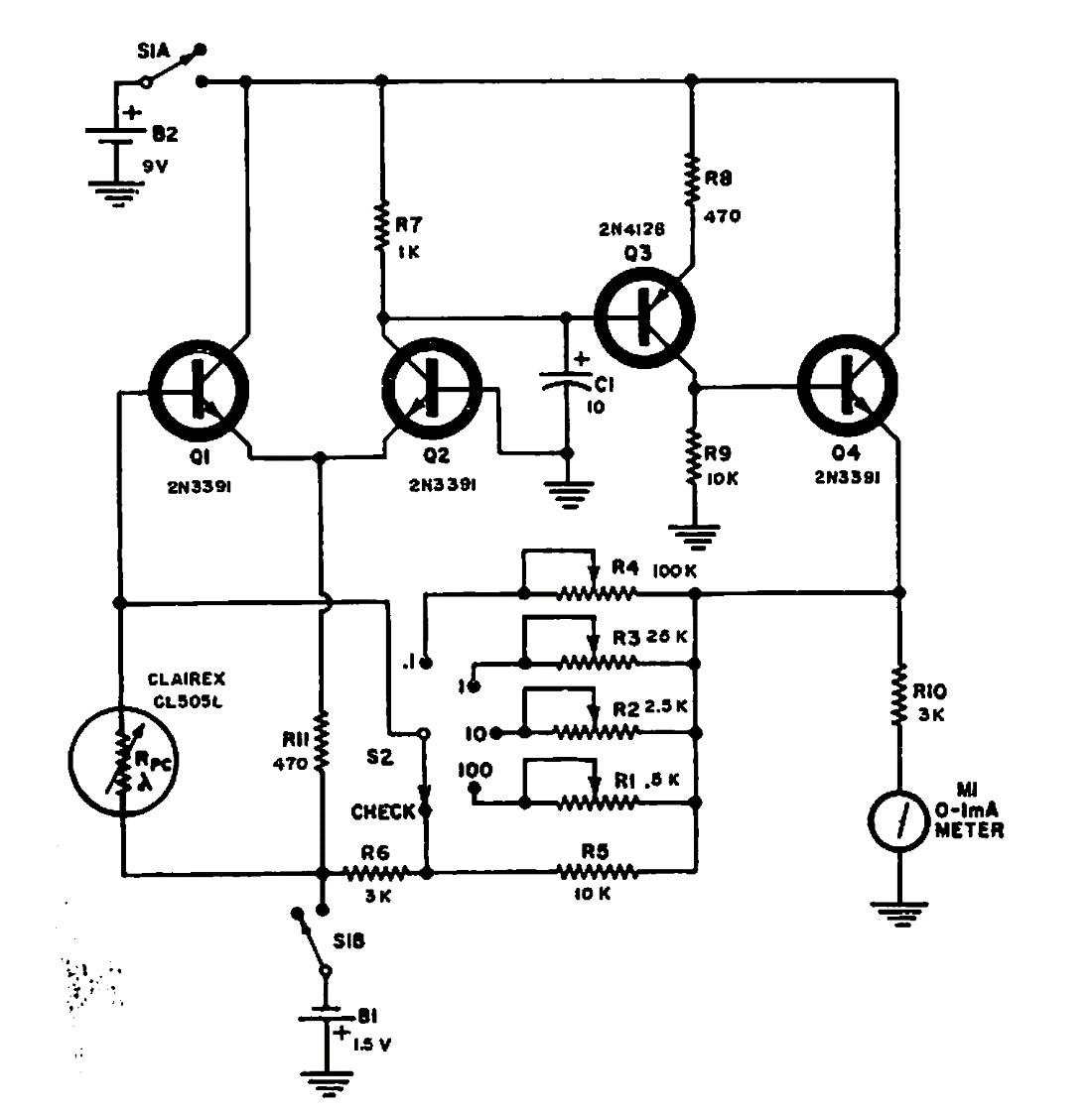 Utilizado para medir la luz nocturna con el fin de ajustar la exposición de las cámaras, este circuito se encontró en una Electronics World de 1969. El sensor es un LDR y los transistores son de esa época.
