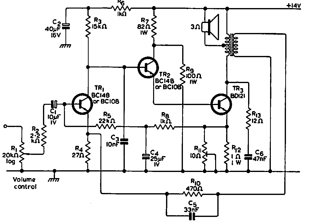 Este amplificador de transistor de 5 W para el automóvil se encontró en una documentación en inglés de 1969. Los transistores son de esa época y el transformador es de un tipo especial.