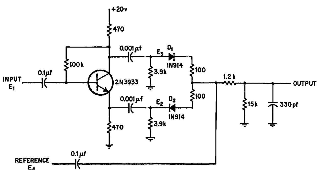 Encontrado en una documentación de 1969, este circuito para la banda de 20 MHz no usa transformador. El circuito es un detector de fase que utiliza el transistor de la época.