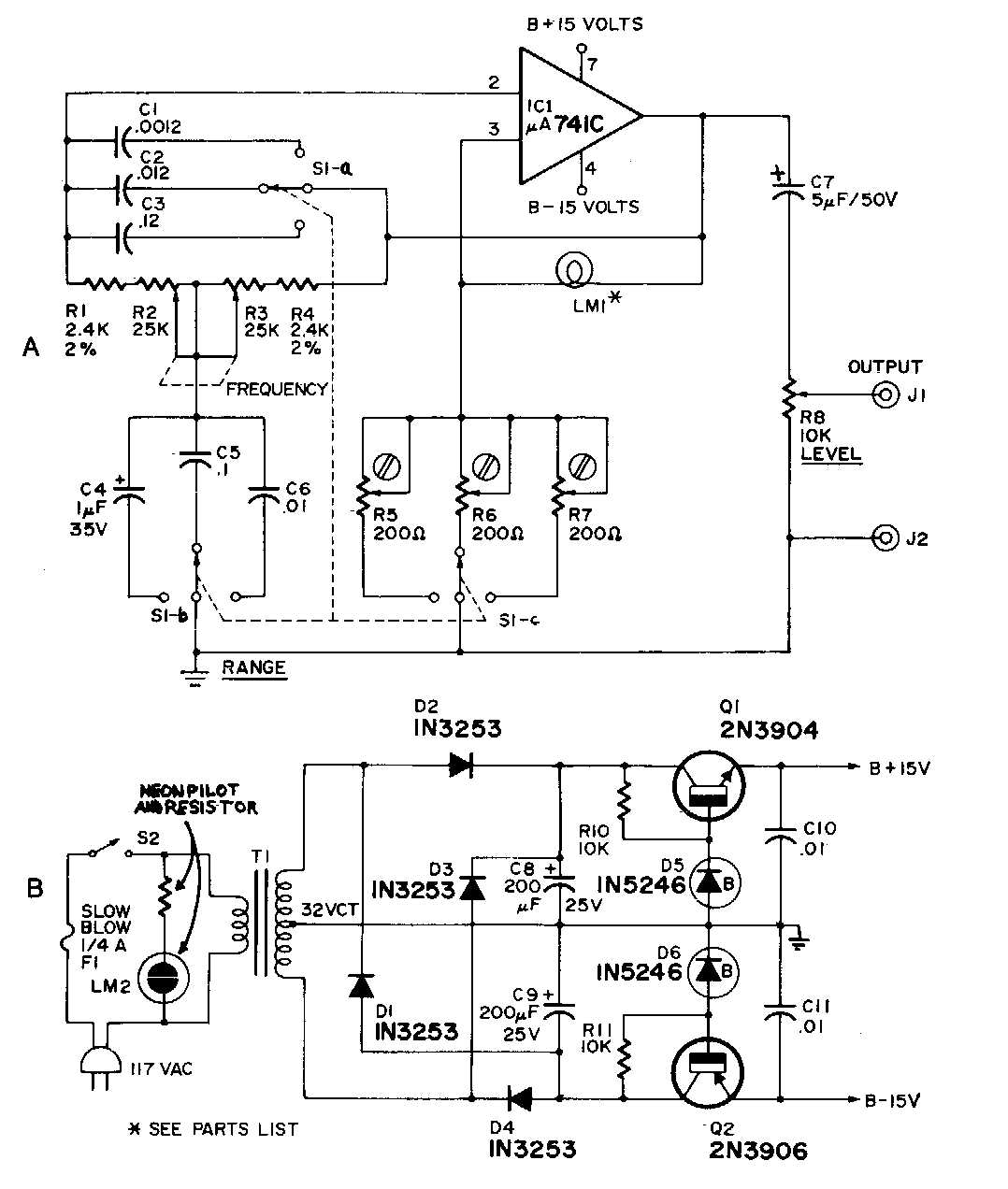 En la figura tenemos el circuito de un generador de audio completo usando el 741. El circuito se encontró en una Radio Electronics de los años 90. Incluye la fuente simétrica implementada con transistores de propósito general.