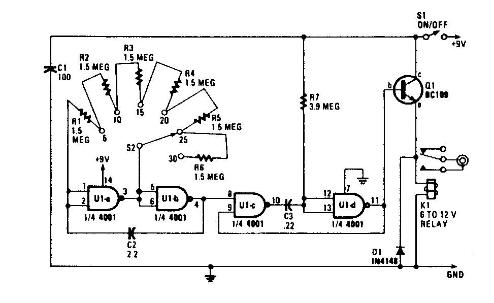 Este circuito es del momento en que se utilizaron los proyectores de diapositivas. Lo encontramos en un tanque WelsThink Tank de los 90. Los tiempos de espera se pueden ajustar de 5 a 30 segundos.