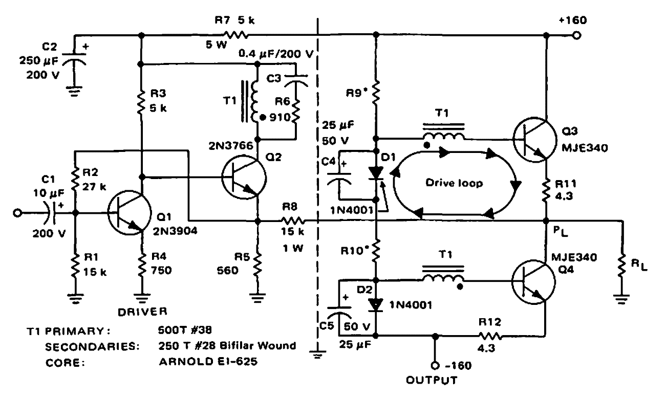 Con una salida de 7,5 W a 110 V, este circuito se encontró en una documentación de Motorola de 1968. El circuito tiene un rango operativo de 95 a 2 000 Hz.