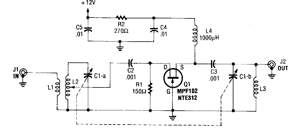 Este circuito se encontró en una Popular Electronics de los años 90. El circuito ha ganado de 10 a 20 dB y la fórmula para determinar las bobinas se da al lado del diagrama.