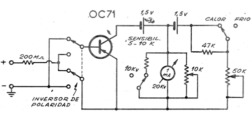 Este voltímetro tiene una resistencia de entrada de 200 M ohms (se pueden utilizar resistencias de 47 M ohms en serie para obtener esa resistencia). El circuito es de una publicación argentina de 1973 y transistores equivalentes pueden ser empleados. El potenciómetro de ajuste de nulo de 50k puede ser de 47k. La escala de corrientes de 1 mA de un multímetro común puede utilizarse en lugar del instrumento original.
