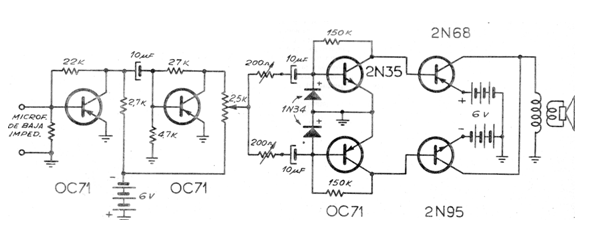 Encontramos este amplificador de 4 W en una antigua publicación argentina de los años 70. El circuito puede ser elaborado con transistores de potencia más modernos como los TIP31 y TIP 32 en la salida y BD135 y BD136 como controladores, pero los transformadores son elementos críticos en el proyecto. Si se utiliza fuente, debe ser simétrica de 6 + 6 V en lugar de dos baterías, Para el sector de preamplificación se pueden utilizar pilas comunes, ya que el consumo de esta etapa es bajo.