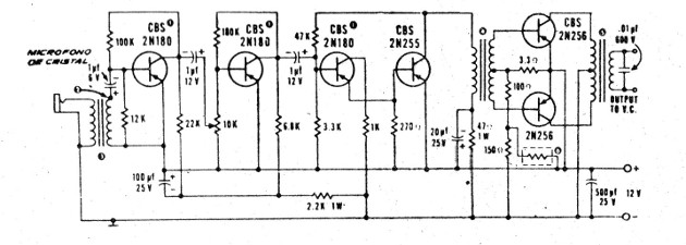 Este circuito es de una antigua revista argentina de los años 70. La dificultad para su montaje está en la obtención de los transformadores, ya que para los transistores podemos usar tipos más modernos como los TIP32 en la salida. La alimentación es de batería de 12 V y la potencia es de algunos watts. El micrófono utilizado es del tipo piezoeléctrico (sin el transformador) o de baja impedancia (con el transformador).