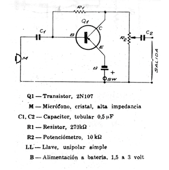 Este circuito es de una antigua publicación de los años 70. Puede ser implementado con transistores modernos como el BC558. El circuito es alimentado por una o dos pilas pequeñas y su consumo es muy bajo. Con la inversión de la polaridad de la alimentación, podremos usar transistores NPN como el BC548 o BC549.