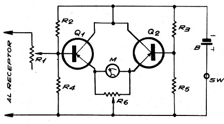 Los esímetros o S-meter son medidores de intensidad de señal, acoplados a receptores de telecomunicaciones para indicar la intensidad de la señal de la estación que se está recibiendo. Este circuito utiliza un indicador de 0-1 mA y el ajuste es hecho por R6 de 47k. Los transistores son BC558 y el circuito se alimenta con pilas. R1 es de 10k y R2 / R3 de 22k. R4 y R5 son resistores de 10k. El circuito se conecta al detector del receptor. El circuito es de una publicación de los años 70. La alimentación se realiza con 3 V.