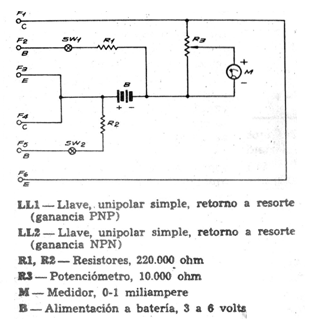 El instrumento indicador de este probador de transistores, de una publicación argentina de los años 70, puede ser la escala correspondiente de corrientes de un multímetro común. El circuito prueba tanto transistores NPN como PNP dependiendo de su conexión. La alimentación se realiza por dos o cuatro pilas pequeñas. El ajuste es para el fondo de escala del instrumento, tomando como referencia un transistor de ganancia conocido.