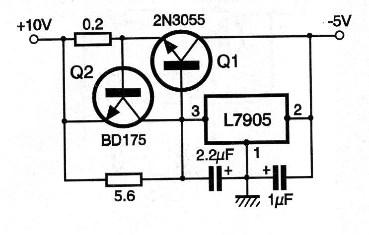 Este circuito tiene una etapa de potencia con transistores que permite obtener una corriente mayor que la del integrado utilizado. Va para integrarse con otras tensiones. El transistor 2N3055 debe tener un disipador de calor.
