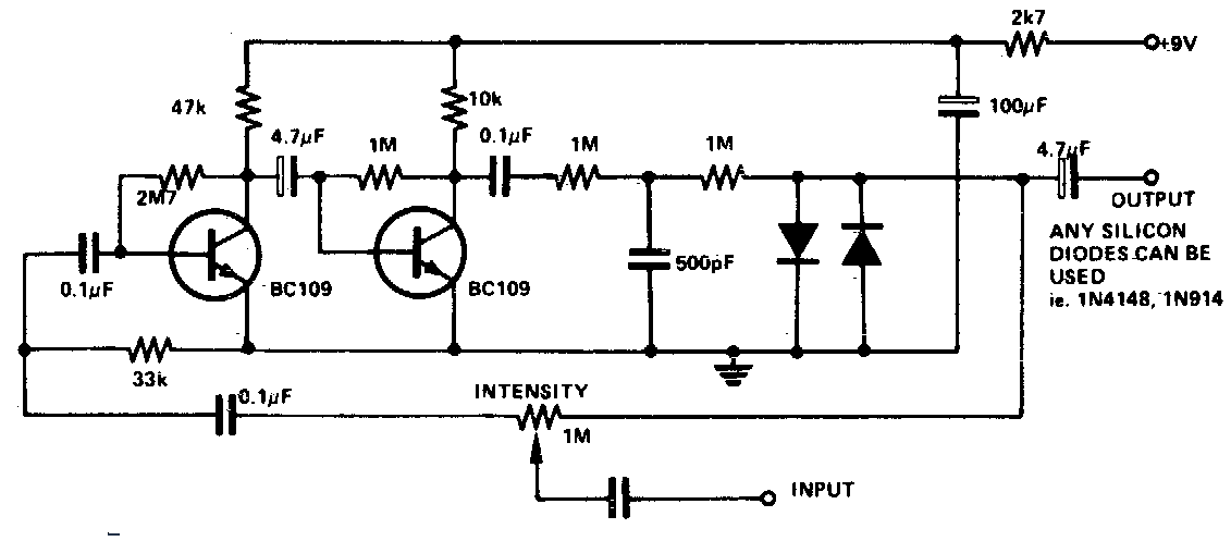 Este circuito de efecto fuzz para guitarra se encontró en la documentación de los años 90. Los transistores pueden ser el BC549. Los cables de entrada y salida de señal deben estar apantallados.