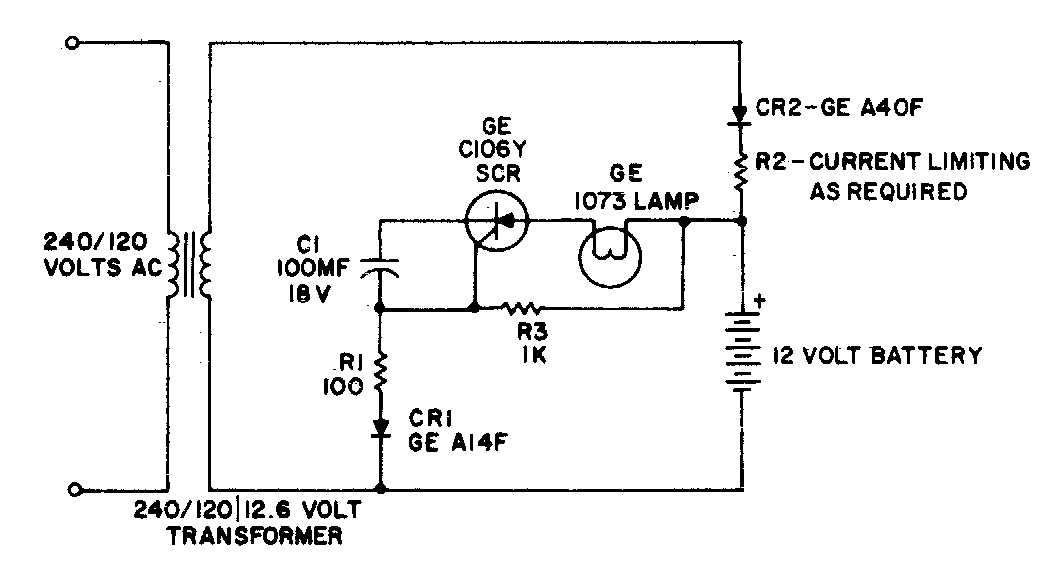 Este circuito aparece en otra parte de esta sección, obtenido de otra documentación. El circuito es para baterías de plomo-ácido y la lámpara se puede reemplazar por LED de alto brillo.