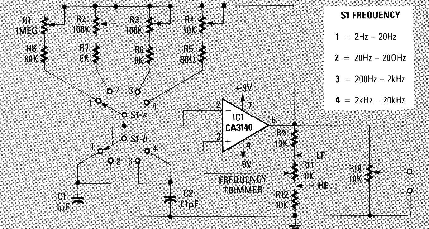 Este excelente generador de señales rectangulares se encontró en Radio Electronics en 1989. Los rangos están determinados por los ajustes de los potenciómetros y los condensadores asociados. El circuito debe estar alimentado por una fuente simétrica.