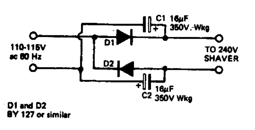 Este circuito permite utilizar afeitadoras de 220/240 V en la red de 110 V. Los diodos pueden ser rectificadores de propósito general como el 1N4007. La corriente de salida máxima es del orden de 1A.
