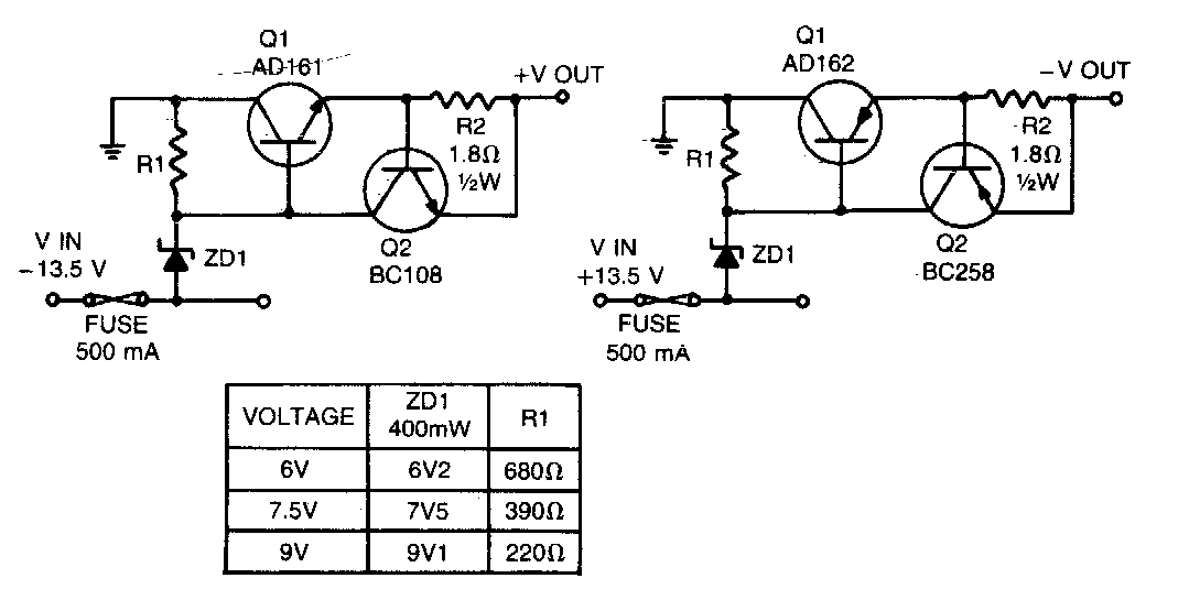 En la figura tenemos dos configuraciones típicas de reguladores de tensión con protección contra cortocircuito. Los circuitos son de los años 70 y se pueden diseñar con transistores equivalentes modernos. R1 determina las tensiones junto con ZD1.