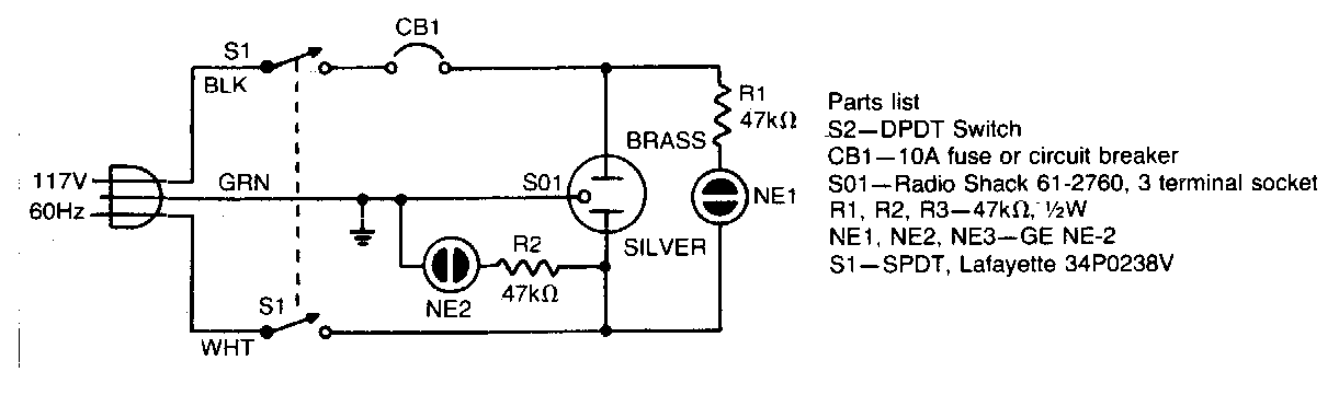 Este circuito simple para una red común de 110 V se encontró en una documentación estadounidense de la década de 1980. El circuito utiliza lámparas de neón como indicadores.
