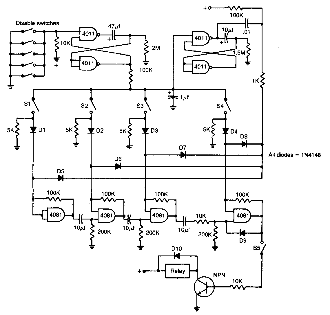 Encontramos este circuito en una revista inglesa de los años 70. El circuito utiliza interruptores que deben activarse en la secuencia correcta para que se active el relé.