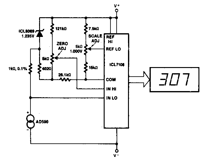 Este termómetro con escala Kelvin y ajuste a cero con el ICL8069 se encontró en documentación de los años 80. El circuito integrado es raro en la actualidad.