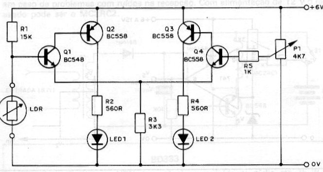 Este circuito consta de un fotómetro diferencial. P1 debe configurarse de modo que se apaguen los dos LED. Esto ocurrirá cuando la intensidad de la luz corresponda a la escala de calibración de P1. El circuito tiene bajo consumo y puede funcionar con baterías. Básicamente es un amplificador diferencial con transistores.