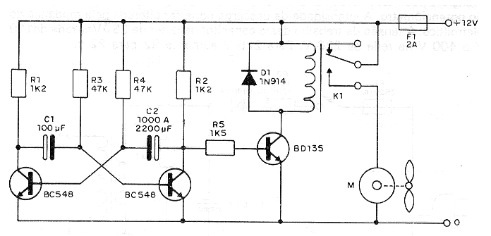 Este circuito enciende y apaga un pequeño ventilador de 12 V a intervalos determinados por los valores de C1 y C2. Estos componentes se pueden cambiar en una amplia gama de valores. El relé es de 12 V y otros equipos que necesitan ser controlados de forma intermitente se pueden conectar a los contactos del relé. Los equipos conectados a la red eléctrica también se pueden controlar, siempre que se alimenten por separado.