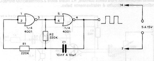 Este circuito también funcionará con el 4011. La frecuencia estará entre unos pocos hertz y unos pocos megahertz dependiendo del valor de C1. Para 1 uF la frecuencia será del orden de 1 Hz. La alimentación se puede realizar con tensiones de 5 a 15 V y la señal que genera es rectangular. Vea un circuito similar a este en la sección Circuitos simulados.
