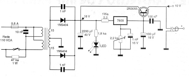 Este circuito de una documentación de 1997 fue originalmente creado para ser utilizado con cámaras de vídeo tipo Camcorder. Sin embargo, se puede utilizar en otras aplicaciones que requieren corrientes de hasta 3 A, con una alimentación de 12 V. El transformador es de 3 A y el transistor de potencia debe montarse en un buen radiador de calor. El trimpot ajusta la tensión de salida a 12 V.