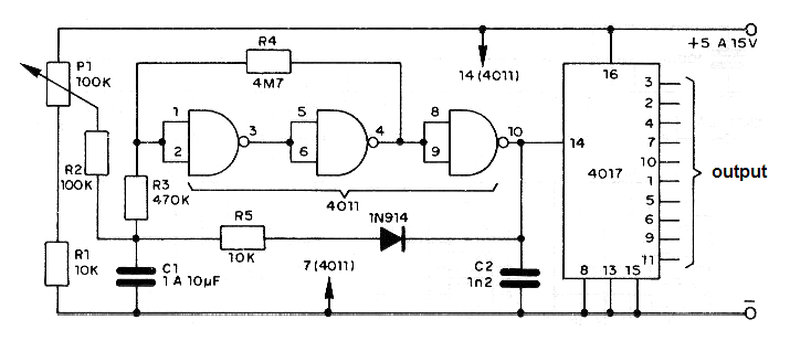Este circuito genera pulsos en secuencia en la salida 4017, a una velocidad que se establece en el potenciómetro P1 y que también depende de C1. El circuito se puede alimentar con tensiones de 5 a 15 V. Obtenga más información sobre el funcionamiento de este circuito descargando circuitos secuenciales del sitio web y también del curso de electrónica digital. El artículo que trata sobre el funcionamiento del 4017 también es interesante por cualquier cambio en el número de salidas del circuito.