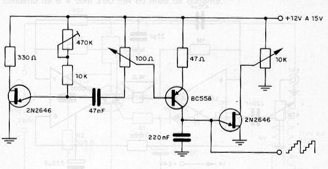 Aunque utiliza un transistor unijuntura, que ya no es un componente muy utilizado en la actualidad, este circuito genera una señal de baja frecuencia, en forma de escalera. La frecuencia y características de la señal deben ajustarse en los tres potenciómetros del circuito, utilizando un osciloscopio como referencia. El consumo de circuito es bastante bajo, pero se debe utilizar una fuente con buen filtrado.
