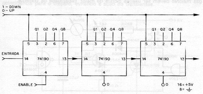 Este contador TTL Up-Down utiliza circuitos integrados 74190. En la figura se muestran tres módulos que permiten contar de 000 a 999 o de 999 a 000. En la figura mostramos cómo programar el conteo progresivo o regresivo. Las señales de salida deben aplicarse a los decodificadores para excitar las pantallas. La alimentación debe realizarse con una tensión de 5 V y hay una entrada de habilitación (enable).