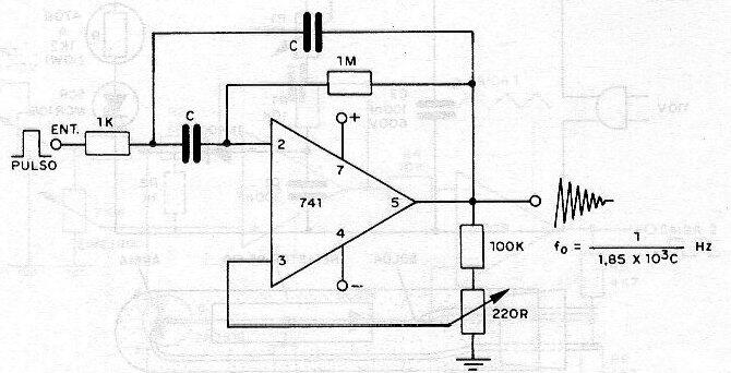 Un pulso aplicado a la entrada de este circuito provoca que se genere una señal sinusoidal amortiguada cuya frecuencia depende básicamente del capacitor utilizado, según la fórmula que se da a continuación del diagrama. El factor de amortiguación se ajusta en el trimpot de 220 k ohmios. La fuente de alimentación debe ser simétrica de 5 a 12 V. Ver en la sección de circuitos simulados este circuito en funcionamiento y en la sección de matemáticas para electrónica, más fórmulas para el cálculo de los componentes. Recuerde que las oscilaciones amortiguadas son las producidas por instrumentos de percusión.