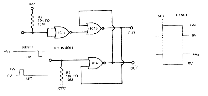 Encontré este circuito en un artículo de la revista Electronics Today International en julio de 1979. Es una configuración biestable que utiliza dos puertas NOR de un circuito integrado 4001. La señal de set y reset consta de pulsos, positivo para Set y negativo para Reset con la tensión de alimentación producida externamente como se indica en el diagrama. El suministro se puede realizar mediante tensiones de 5 a 15 V. Nunca utilice una fuente sin transformador en este tipo de circuito.