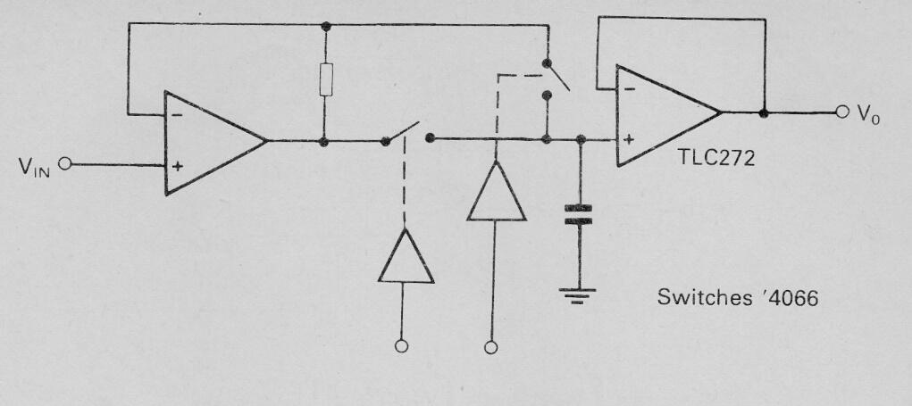 Este circuito se encontró en el Linear Circuits Applications de Texas Instruments, originalmente usando el amplificador operacional doble con FET TLC272, pero se puede implementar con equivalentes como el CA3140. La fuente de alimentación debe ser simétrica. El capacitor sin valor depende de la frecuencia de muestreo y puede asumir valores típicos entre 10 nF y 1 uF.