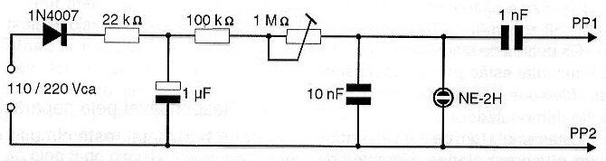Con este oscilador de relajación con lámpara de neón podemos generar señales de audio de pequeña intensidad para trabajos de investigación en circuitos de audio. Tenga en cuenta que el circuito no está aislado de la red eléctrica y utiliza solo componentes pasivos. La frecuencia depende del capacitor de 10 nF y se establece en el potenciómetro de 1 M ohms. Como el circuito no está aislado, solo debe usarse en circuitos que no estén conectados a la red eléctrica y aun observando las reglas de seguridad que requiere la carcasa.