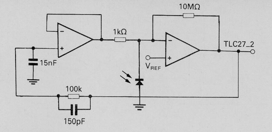 Este circuito es sugerido por Texas Instruments en el Linear Circuits Applications, basado en el operacional con FET TLC272, pero se pueden usar equivalentes. La fuente debe ser simétrica y la ganancia depende de las resistencias de retroalimentación. Vref se puede obtener con un divisor que aplica 0 V usando dos resistencias de 100k.
