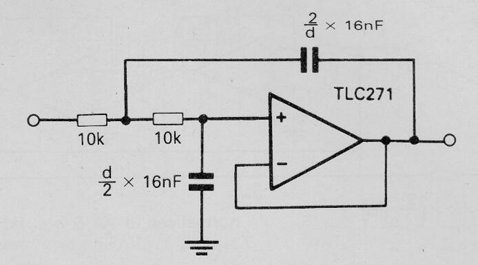Este filtro es sugerido por Texas Instruments em el Linear Circuits Applications, edición de 1986. El circuito usa un TLC271, pero se pueden usar equivalentes operacionales como el CA3140. Vea en la sección de matemáticas cómo calcular los componentes de este circuito. La impedancia de entrada es de 10 k y la fuente debe ser simétrica.
