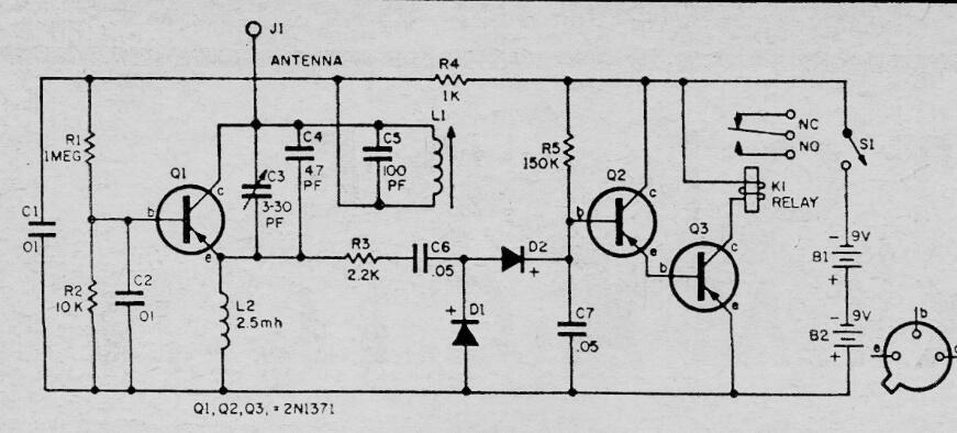 Este circuito es de una publicación argentina de 1965 (Radio Chasis Televisión). Los transistores originales están hechos de germanio, pero podemos probar el diseño con transistores de silicio equivalentes. La bobina L1 consta de unas 30 vueltas de cable 28 en una varilla de ferrita y la alimentación debe ser de 9 a 18 V, dependiendo de la tensión del relé. La antena es un trozo de cable blindado o una plancha. Se puede hacer un enlace de alambre para colgar en la manija de una puerta. Cualquier cambio en las resistencias de polarización puede ser necesario cuando se utilizan transistores de silicio.