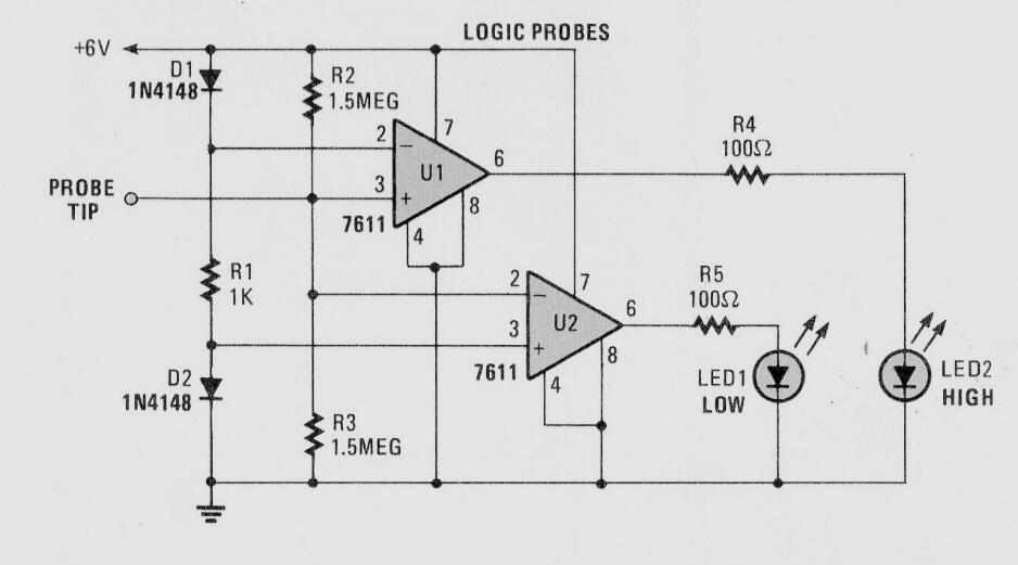 Este circuito indica el nivel lógico de un circuito CMOS, retirando la alimentación del circuito que se analiza. Los circuitos integrados son amplificadores operacionales que pueden reemplazarse por equivalentes que son más fáciles de obtener. El circuito es de una revista estadounidense de los 90.