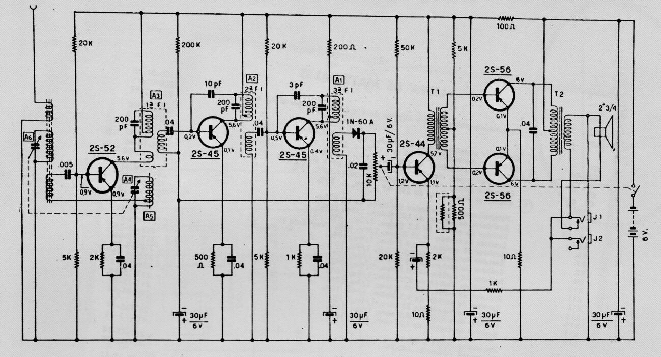 Este circuito es para coleccionistas. Es el circuito de una de las radios de transistores más populares de los años 60 y 70, la pequeña Spica con 4 pilas, para el rango de onda media. Importante para quienes están recuperando una de estas radios.