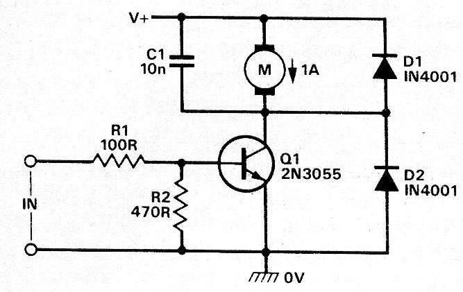 Este control permite arrancar o parar un motor hasta 3 o 4 A con una señal de baja intensidad. El transistor debe montarse en un radiador de calor y la tensión de funcionamiento normalmente puede estar entre 5 y 15 V. La señal debe tener una corriente de al menos 100 mA.