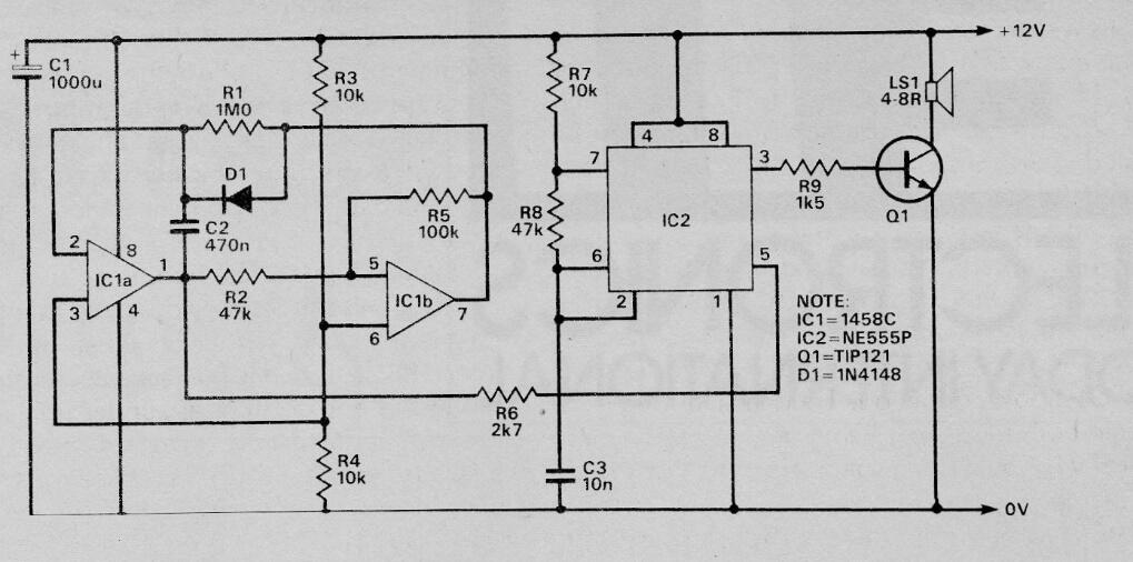 Este circuito se encontró en una publicación inglesa de 1989, pero se puede ensamblar fácilmente, ya que los componentes utilizados son comunes. El transistor de potencia debe montarse en un radiador de calor; El NE1458 se puede reemplazar por dos amplificadores operacionales 741.