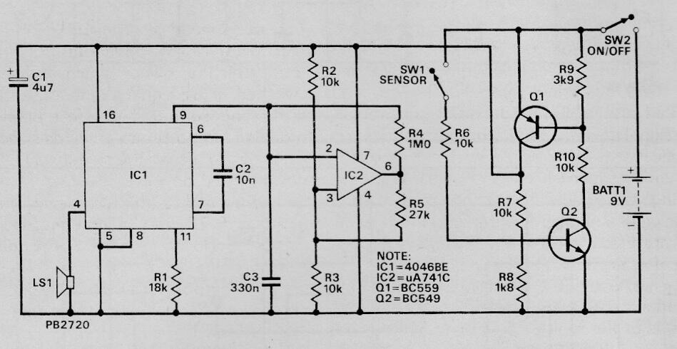 Este circuito, que puede utilizar un sensor de láminas, está indicado para puertas y ventanas. El circuito se obtuvo en una revista de 1989, pero se puede ensamblar con los transistores originales, ya que todavía son comunes. El circuito, que tiene un bajo consumo en espera, puede ser alimentado por baterías o por batería. El transductor es piezoeléctrico o de alta impedancia (más de 80 ohms).