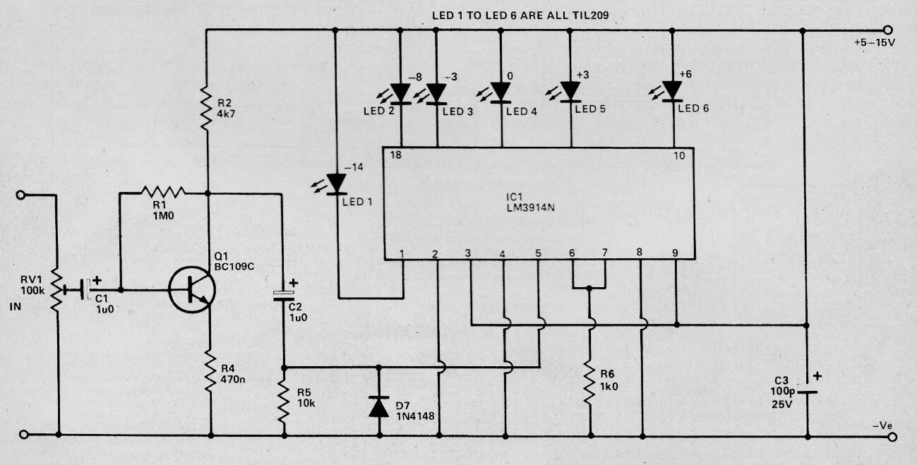 Este sencillo VU (Volume Units) o indicador de volumen para amplificadores se obtuvo en una revista inglesa de 1980. El transistor Q1 puede ser reemplazado por un BC548 y los leds son rojos o de otro color común. La corriente del LED es del orden de 6 mA.
