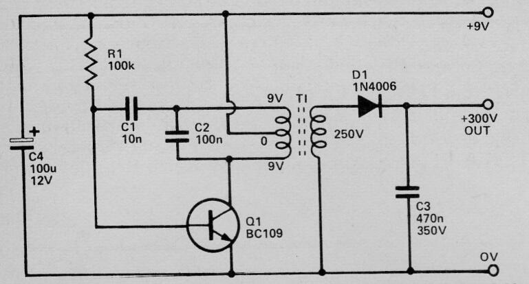 Aunque la tensión de salida obtenida es alta, la corriente es muy baja, dada la potencia del transistor. El transistor puede ser BC548 o BD135 y los capacitores de cerámica o poliéster para C1, C2 y C3. El circuito es de una publicación inglesa de 1980.