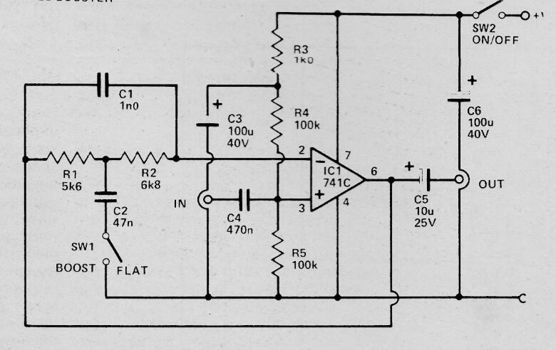 La curva de respuesta de este circuito tiene un impulso máximo de alrededor de 6 kHz. La escala vertical está en dB. El circuito utiliza una fuente de alimentación de 9 V y su consumo es muy bajo. La tecla cuando se activa permite el refuerzo y sin la tecla, la respuesta es plana. Los cables de entrada y salida de señal deben estar blindados. El circuito es de una publicación en inglés de 1979 y se pueden utilizar amplificadores operacionales equivalentes.