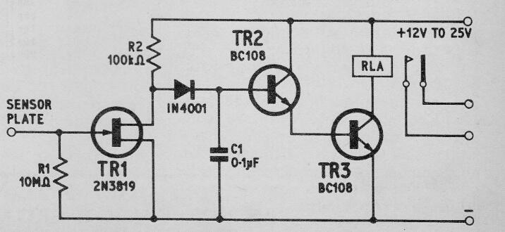 Este circuito es de una publicación de 1974, pero se puede ensamblar fácilmente utilizando componentes más modernos. Podemos usar BF245 para FET y BC548 para otros. La alimentación de 6 a 12 V debe realizarse de acuerdo con la tensión del relé utilizado. Nunca use una fuente sin un transformador para alimentar este circuito. El cable del sensor no debe ser demasiado largo.
