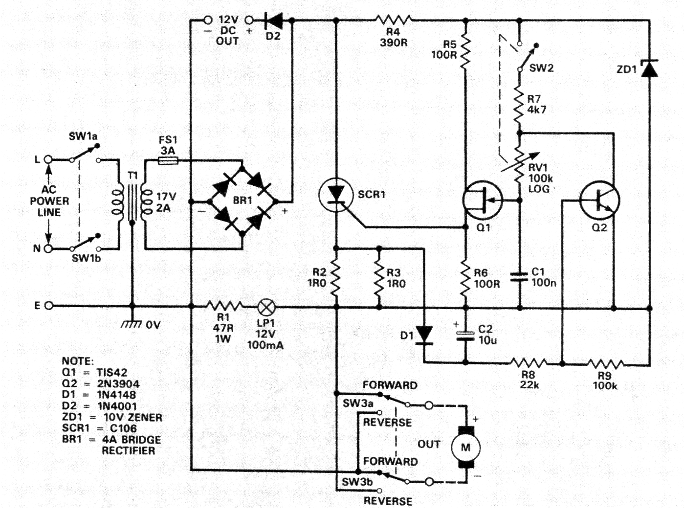 Este control de una publicación de 1989 se puede ensamblar con varios componentes equivalentes. El SCR, por ejemplo, puede ser el TIC106. El transistor Q1 puede ser BF245 y Q2 puede ser BC548. El puente de diodos puede estar formado por diodos 1N5404 y el transformador puede tener de 17 a 20 V de tensión secundaria. El SCR debe montarse en un radiador de calor. Los otros componentes son comunes.
