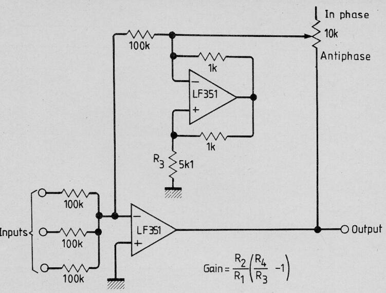 Lo interesante de este circuito encontrado en una revista inglesa de 1985 es que controla la ganancia de un mezclador para tener la señal en fase o con la fase invertida. En particular, este circuito se vuelve útil con micrófonos, eliminando la retroalimentación al invertir la fase. El circuito se puede probar con otros amplificadores operacionales y la fuente de alimentación debe ser simétrica. La fórmula al lado del diagrama da la ganancia.